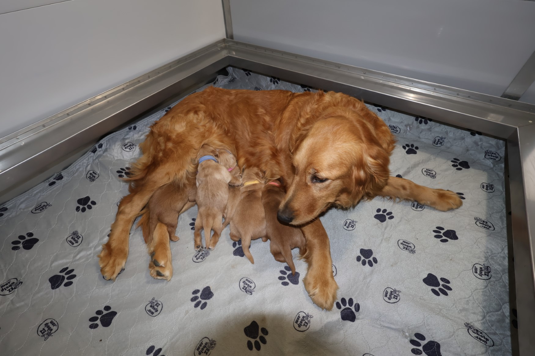 “Queenie” is a sweet & calmer natured darker Golden with Champion Bloodlines. She relates well to children and other dogs. She has had very nice puppies to Ryan in the past that were especially gentle and nearly all showed potential for service work; according to a professional dog trainer’s aptitude testing on them. She is smart and also exceptionally gentle with children and other dogs. She has passed all 4 OFA’s and Embark DNA testing without any issues at all. Shorter and 60-65 lbs.